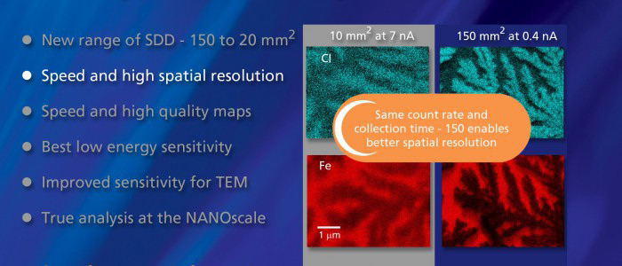 - A range of detector sizes, from 20mm2 for microanalysis up to an astounding 150mm2 for advanced nanoanalysis